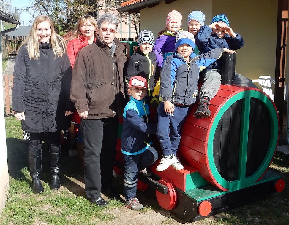 Wie schon im Februar versprochen erhielten die Kinder des Spielhaus Großlohra jetzt ein neues Spielgerät aus den Werkstätten des Berufsbildungszentrums Nordhausen. Weil die Kindertagesstätte bereits ein Spielschiff als Auszeichnung für den vom Kreissportbund Nordhausen veranstalteten Kindergarten-Sporttag erhalten hatte, gab es nun für den erneuten Gewinn des Wettbewerbs eine zünftige Lokomotive zum Toben und Tollen.
