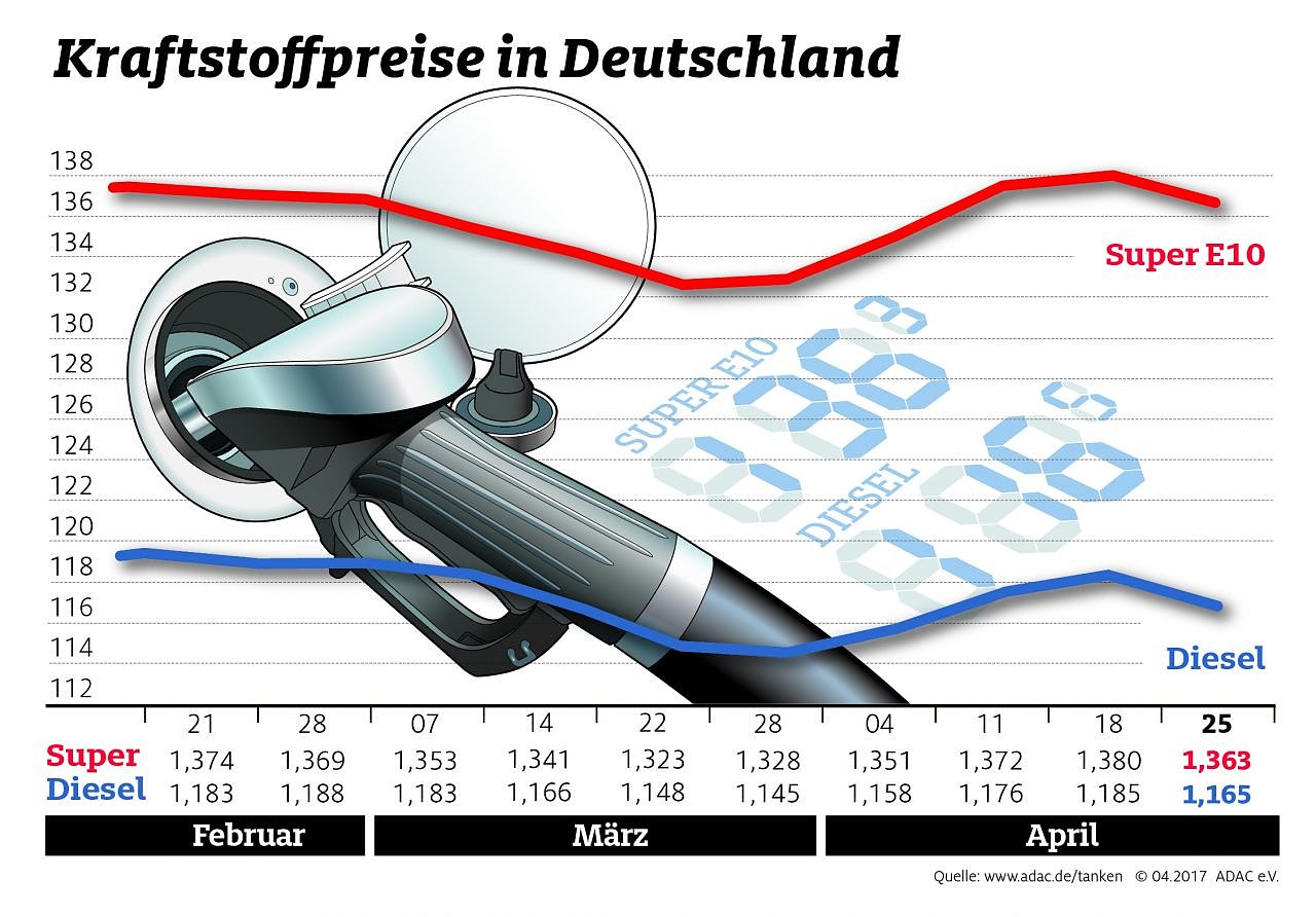 Gute Nachrichten für Autofahrer: Vor dem langen ersten Mai-Wochenende sind die Kraftstoffpreise erneut gesunken. Ein Liter Super E10 kostet derzeit im Tagesdurchschnitt 1,363 Euro und damit 1,7 Cent weniger als in der Vorwoche. Für den Liter Diesel müssen Autofahrer nach ADAC-Angaben 1,165 Euro zahlen, ein Rückgang von 2,0 Cent...