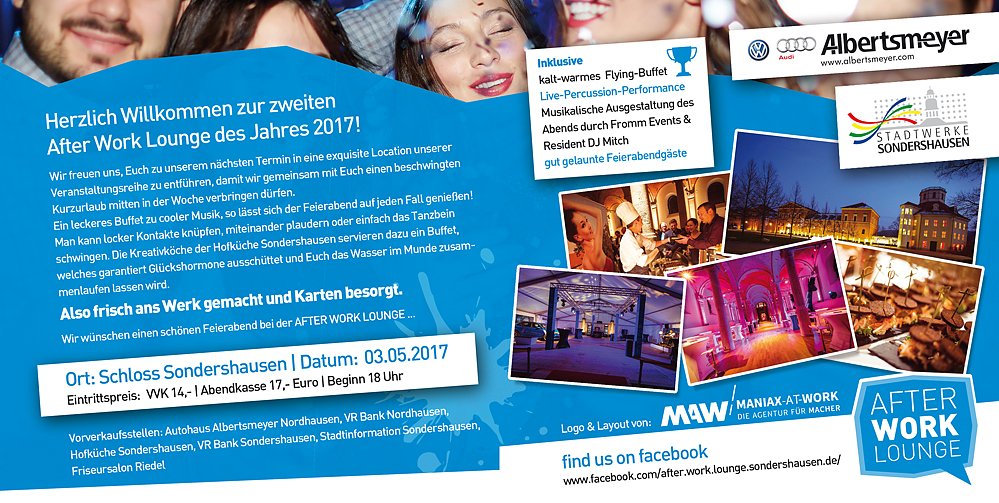 Wir wünschen einen schönen Feierabend bei der AFTER WORK LOUNGE am 03.05.2017 im Marstall des Sondershäuser Schlosses.