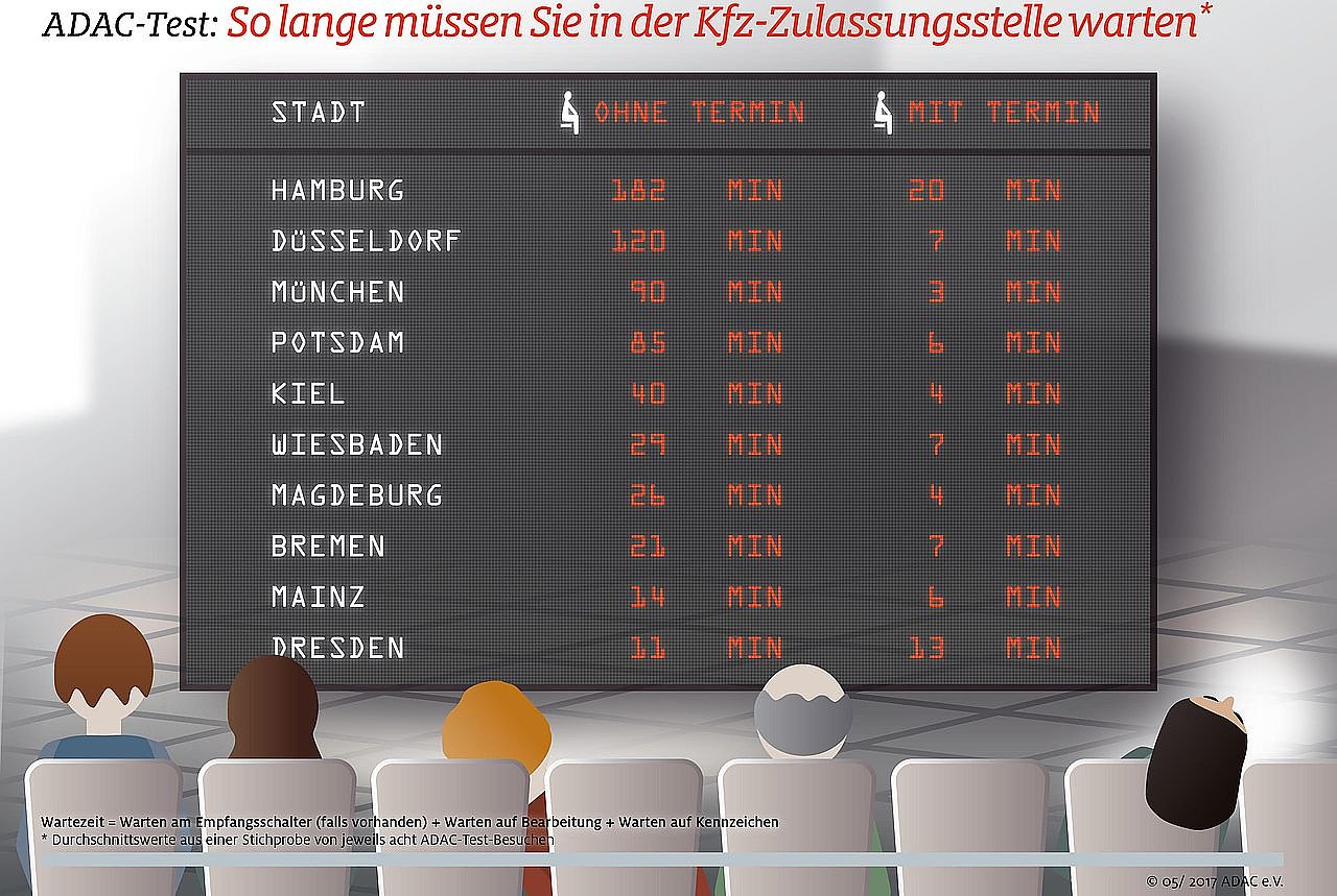 Die ADAC-Tester hatten in den Landeshauptstädten Bremen, Düsseldorf, Dresden, Hamburg, Kiel, Magdeburg, Mainz, München, Potsdam und Wiesbaden jeweils acht Kunden (vier mit Termin, vier ohne) inkognito bei der Ummeldung ihres Privatfahrzeugs begleitet.