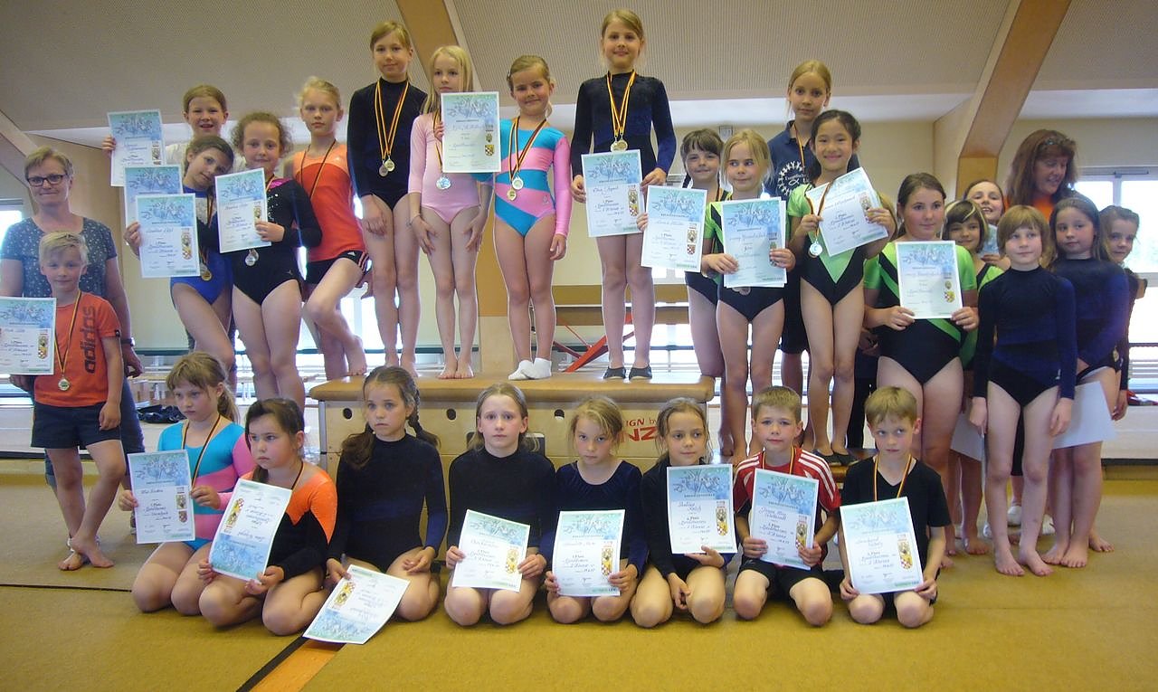 Die Käthe- Kollwitz-Schule, die evangelische Grundschule und die Grundschule Petermann-Grundschule in Bleicherode stellten zusammen fünf Mannschaften und alle Medaillenplätze waren heiß umkämpft. Die doch zahlreich erschienenen Zuschauer der kleinen Gerätekünstler sahen tolle Übungen an Barren, Balken, Boden, Rech und Kasten.