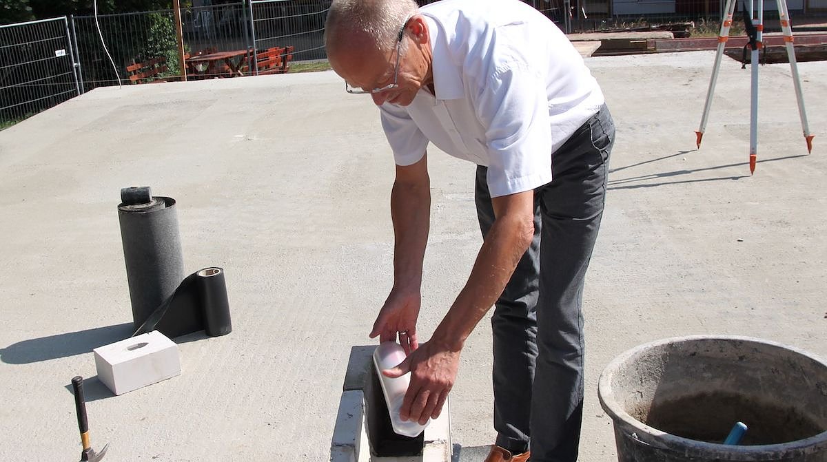 Wir haben hier ein paar Zeugnisse unserer Zeit zusammengestellt, über die sich die Archäologen in einigen Jahrhunderten vielleicht freuen werden. Neben Tageszeitungen, Münzen und Prospekten geht auch ein Kinderbild mit auf die Zeitreise, erklärt Weigel den Inhalt der Kapsel, bevor sie von den Anwesenden mit Zement für eine kleine Ewigkeit eingemauert wurde.
