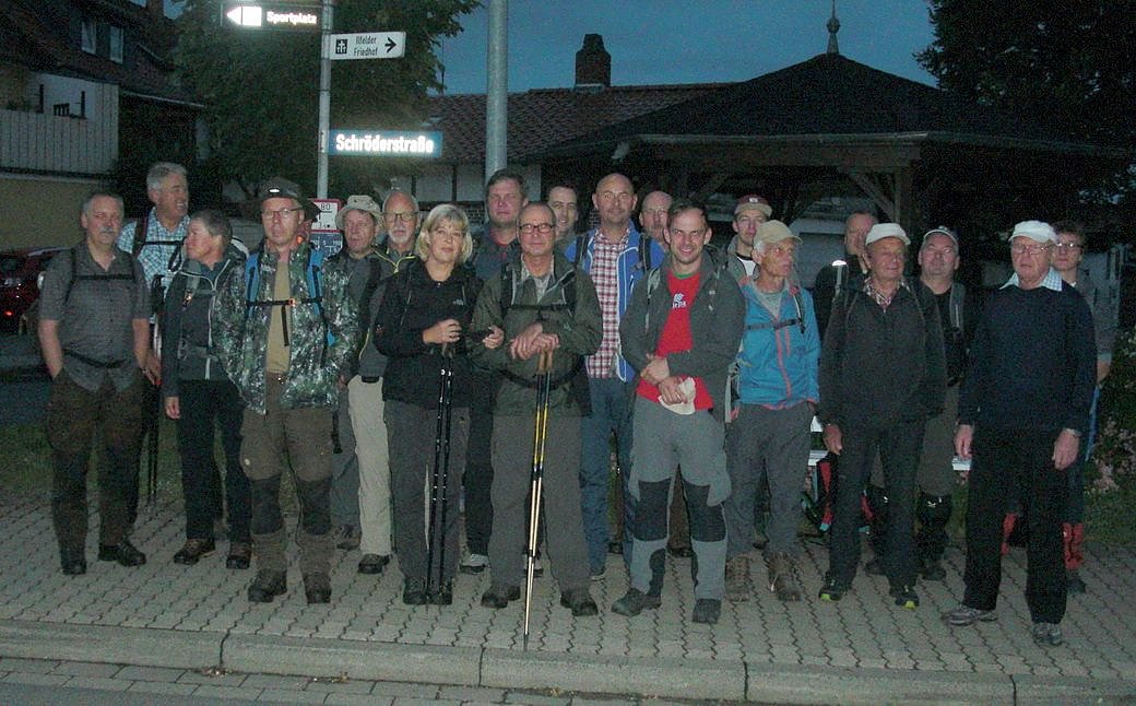 Viele bekannte Gesichter, aber auch neue Wandersleute konnte Andreas Volkmann, verantwortlicher Wanderleiter, begrüßen. Einige Worte von ihm zum Ablauf und Verhaltensweisen für unterwegs und schon ging es los. Autofahrer auf der nahen B 4 wunderten sich über die Gruppe in den frühen Morgenstunden.