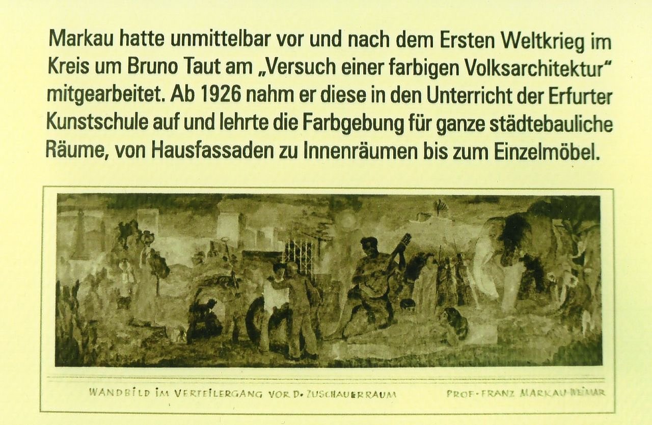 Dort hing ab Mitte der 1950er Jahre ein großformatiges farbiges Gemälde von Prof. Franz Markau aus Weimar. Geboren wurde der Künstler 1881 in Berlin, gestorben ist er 1968 in Weimar. Hier interessiert sein Wirken in Thüringen. Von 1926 bis Ende 1944 leitete er die Fachabteilung Dekorative Malerei an der Kunstgewerbeschule in Erfurt.