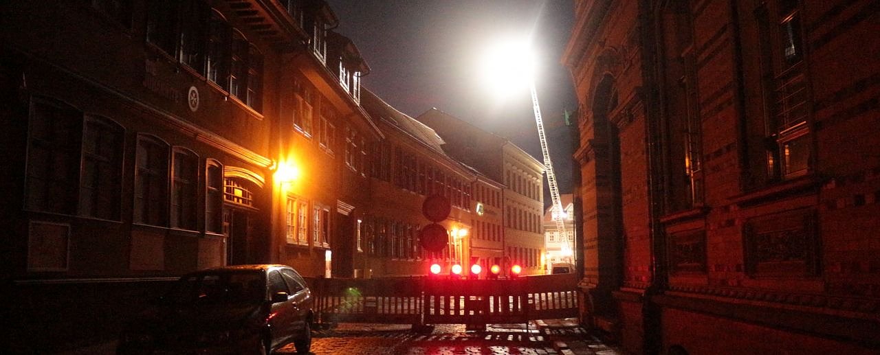 Einsatzende bei Flutlicht - Feuerwehr konnte Dach in der Dr.-Külz-Straße sichern (Foto: Angelo Glashagel)