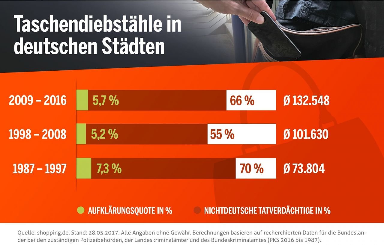 Erstmals hat das Schnäppchen-Portal shopping.de über 400 Städte und Kreise in Deutschland zum Thema Taschendiebstahl untersucht. Fazit: Nicht nur Großstädte stehen im Fadenkreuz der Kriminellen, auch zahlreiche Landkreise haben ihre liebe Not mit den Taschendieben. Die Studienmacher sind zu der Überzeugung gekommen, dass Taschendiebstähle seit Langem keine Bagatell-Straftaten mehr sind. Deren hohe Anzahl ist durchaus auch ein Spiegelbild des Landes. Dennoch stehen die Delikte und die Organisierte Kriminalität noch immer außerhalb der öffentlichen Wahrnehmung – vor allem in den Medien.