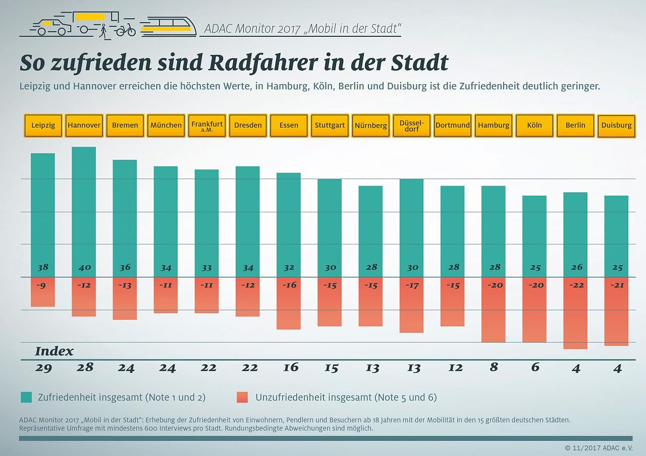 Dies ist das Ergebnis einer repräsentativen Online-Studie des ADAC, bei der Einwohner, Pendler und Besucher die Mobilität in den 15 größten deutschen Städten bewertet haben. Dabei wurden Autofahrer, Nutzer des Öffentlichen Personennahverkehrs (ÖPNV), Fahrradfahrer und Fußgänger nach ihrer Zufriedenheit mit den jeweiligen Verkehrsbedingungen befragt. Im Durchschnitt über alle Städte zeigten sich Fußgänger, ÖPNV-Nutzer und Radfahrer mit ihrem Mobilitätsangebot recht zufrieden. Die Bedingungen für Autofahren wurden hingegen kritisch beurteilt.
