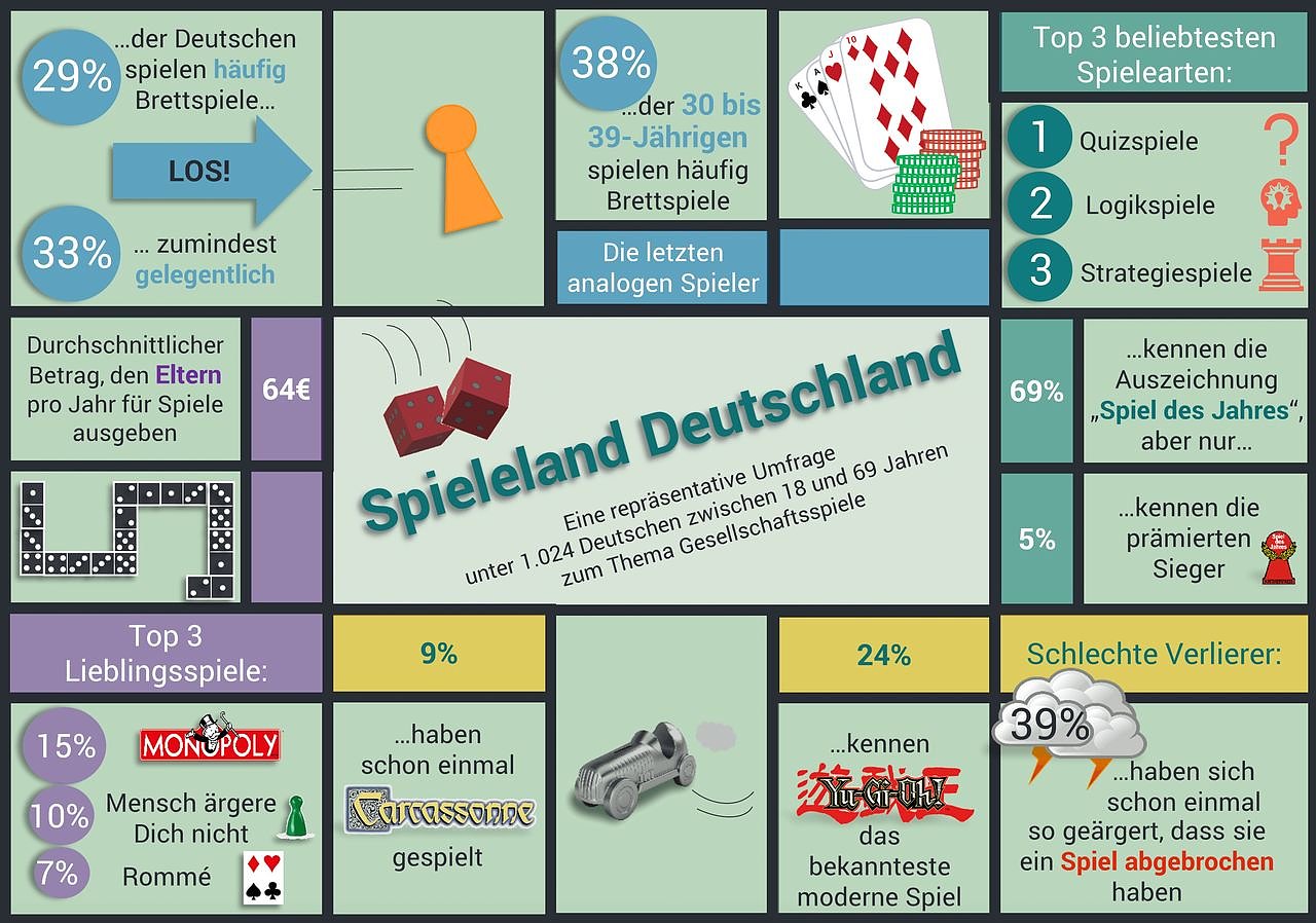 Das Hamburger Marktforschungsinstitut SPLENDID RESEARCH hat im November 2017 im Rahmen einer repräsentativen Umfrage 1.024 Deutsche zwischen 18 und 69 Jahren online zum Thema Gesellschaftsspiele befragt. Untersucht wurde, wie häufig und mit wem gespielt wird sowie wie bekannt und beliebt verschiedene Spiele sind. Zudem wurde erhoben, welche Verlage bekannt sind und wieviel die Deutschen für Spiele ausgeben.