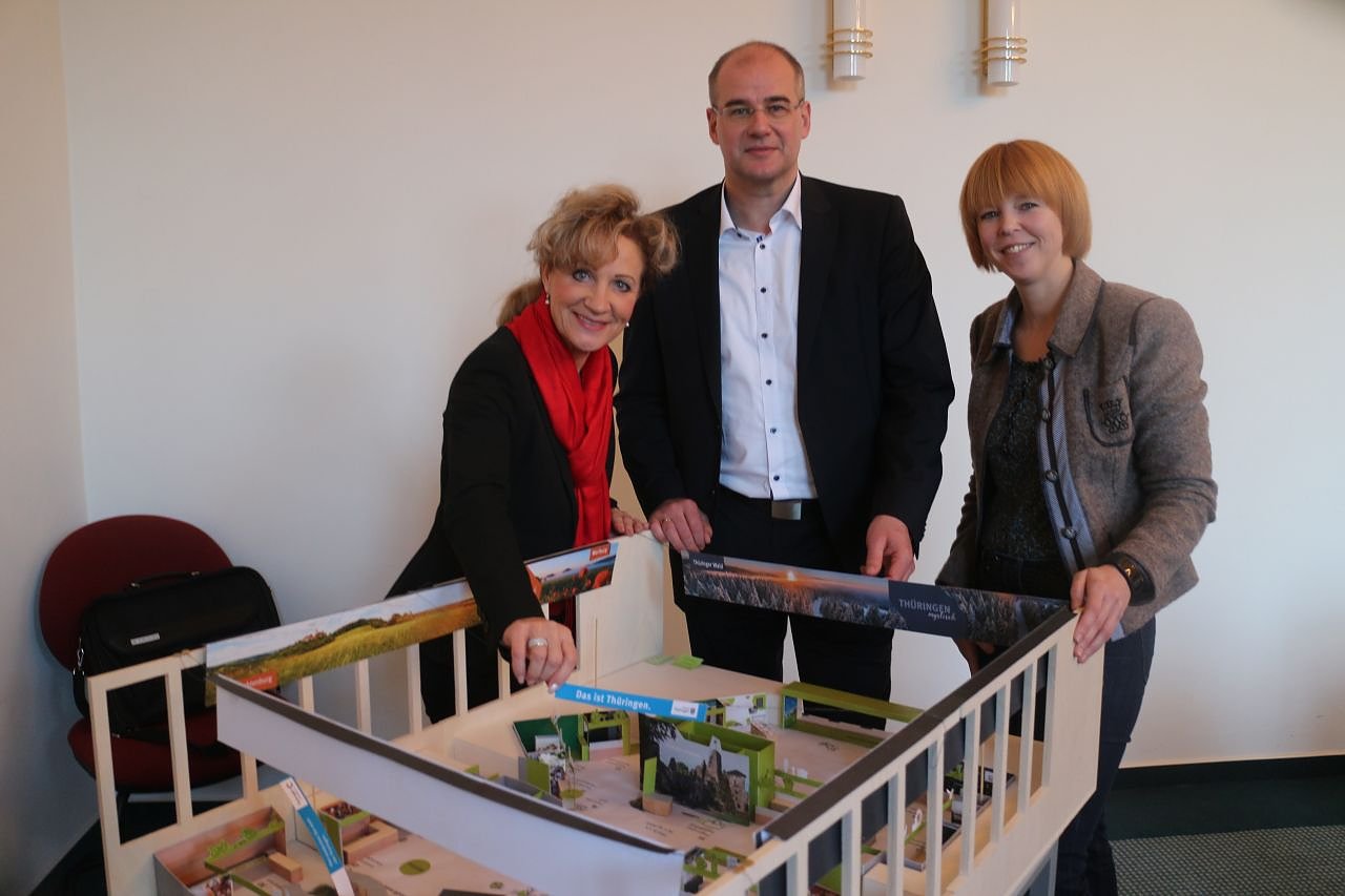 v.l.: Ministerin Birgit Keller, Landrat Matthias Jendricke und Jessica Pieper vor dem Modell des Thüringer Messeauftritts (Foto: Angelo Glashagel)