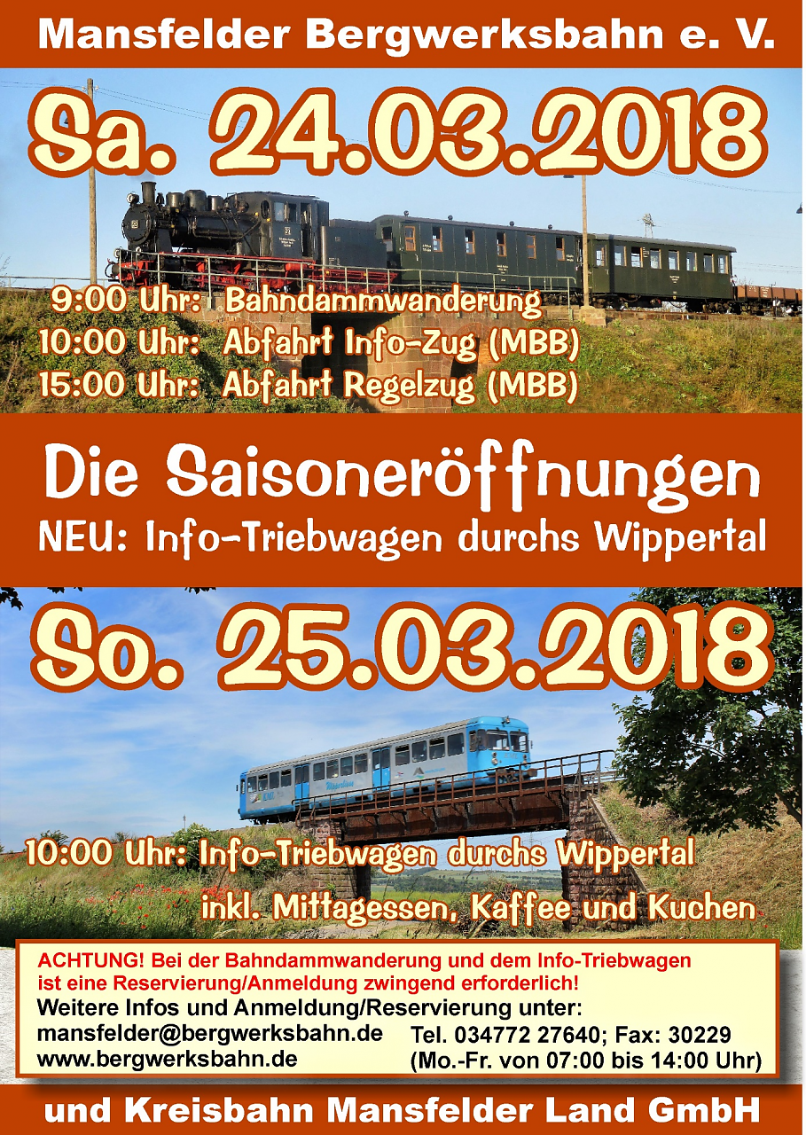 Gemeinsam mit der Kreisbahn Mansfelder Land GmbH will der der Mansfelder Bergwerksbahn e. V. die Saisoneröffnung für die Schmalspurbahn als auch für die Wipperliese an dem Wochenende vor Ostern (24./25. März) gestalten...