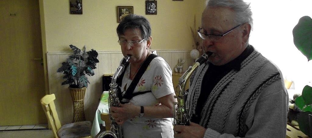 Erika Hoyer liegt die Musik im Blut. Mit der Klampfe in der Hand stimmte sie das Günzeröder Heimatlied Wo am Hamsterberg die Helme fließt … an. Hannelies Brade (geb. Kaempffe) und Ehemann Karl-Heinz, beheimatet in Ellrich, entlockten ihrem Saxophon schöne Lieder. La Paloma fehlte nicht.