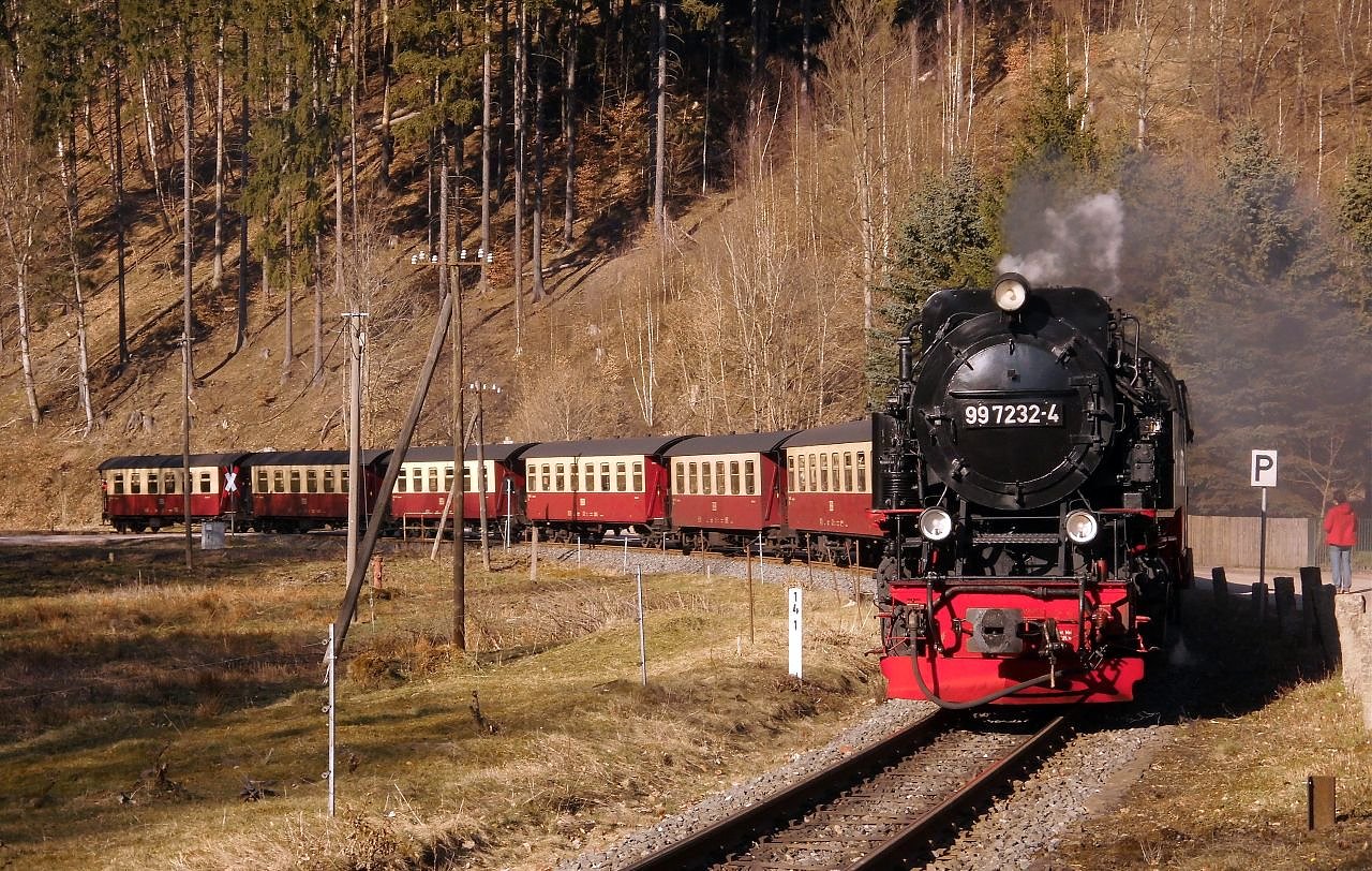 Autor: redDie 99 7232-4 gestern bei der Einfahrt mit dem Nordhäuser Brockendamfzug 8929 in Netzkater. Die lange Kurve vor dem Bahnhof Netzkater ist eine schöne Fotostelle. Man kann schön den ganzen Zug sehen.