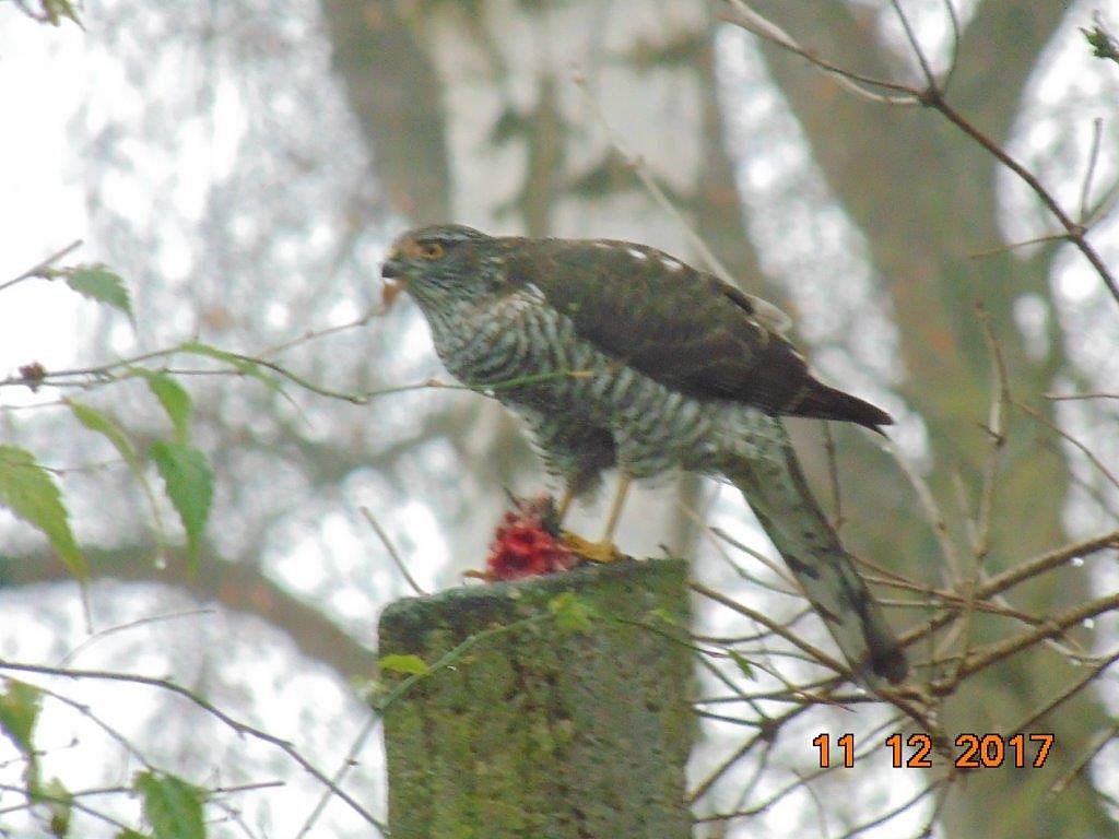Gerd Ritscher zeichnet eine gute Beobachtungsgabe, Geduld und naturkundliches Wissen aus. Ungemütliches Wetter? Nicht unbedingt ein Grund, es sich daheim auf dem Sofa gemütlich zu machen. Naturbeobachtungen sind seine Leidenschaft. Für ihn Entspannung und Erholung pur. Und immer wieder entdeckt es etwas Neues. So ein Sperberweibchen, das gerade einen Vogel, den es gefangen hatte, zerlegt und sich einverleibt. Im richtigen Moment zur Stelle zu sein ist auch mit Glück und Zufall verbunden.
