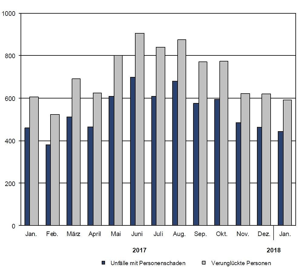 Bei den 444 Unfällen mit Personenschaden wurden 593 Personen verletzt. Die Zahl der verunglückten Personen im Januar sank leicht (-13 Personen). Acht Menschen kamen dabei ums Leben. Die Zahl der schwerverletzten Personen stieg mit 111 Menschen im Vergleich zum Vorjahresmonat Januar 2017 (94 Menschen). Die Zahl der Leichtverletzten sank.