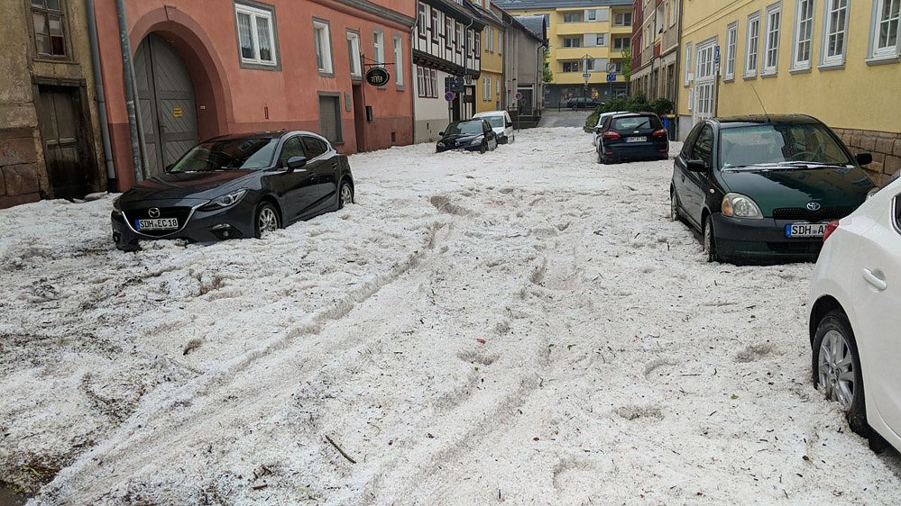 Der mit dem Unwetter einsetzende Hagelschlag hatte viele Blätter von den Bäumen gerissen und zusammen micht den vielen Hagelkörnern die Gullys verstopft, so dass die Kanalisation das Wasser garnicht aufnehmen konnte. Und so wurden die Straßen zu richtigen Flussläufen, welche die Hagelkörner mitrissen. Und da gerade in der Oberstadt die größten Wassermassen runter kamen, ergossen sich die verschiedenen Ströme an die tiefsten Stellen der Innenstand. Und an de Stellen, wo das Wasser zum Stillstand kam, liefen nicht nur die Keller voll sondern lagerten sich auch Unmengen an Hagelkörnern ab.