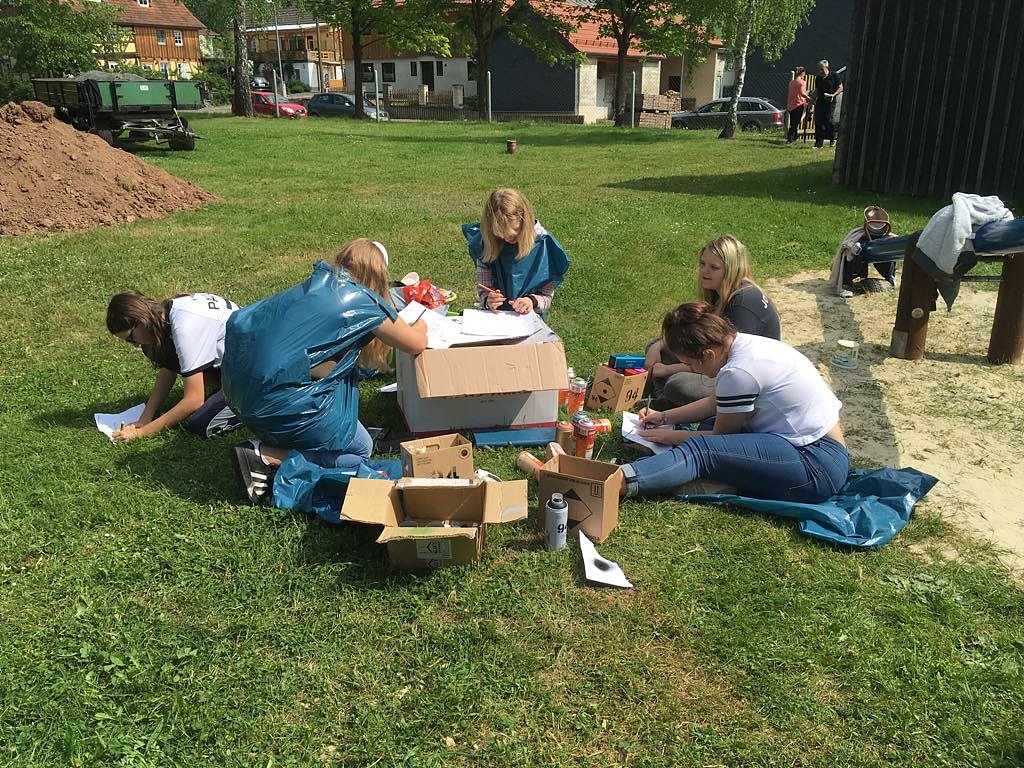 Gemeinsam mit den Mädchen wurde die Fassade neu gestaltet und es sollte ein von den Teilnehmerinnen entwickeltes Grafitti an der Wand entstehen. Nach der Anfertigung verschiedener Skizzen am Freitagnachmittag wurde auch gleich begonnen und die Kinder konnten sich an der Wand ausprobieren. Den Tag haben wir dann bei einem gemütlichen Lagerfeuer, leckeren Grillwürstchen und einer Übernachtung auf dem Gut in Werna ausklingen lassen. Am Sonnabend ging es dann weiter! Leider können wir euch hier keine Resultate zeigen, denn es ist alles noch streng geheim und wurde nach Fertigstellung abgedeckt. Die große feierliche Eröffnung ist am 1.6.2018 - dem Kindertag! Total passend wie wir finden.