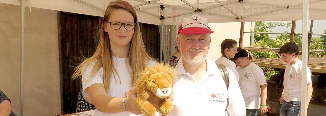 Michael Thomas betreut die DRK-Gruppe des Herder-Gymnasiums, Leonie Krause zeigt das Maskottchen der GruppeUnter dem Motto Hoch lebe die Landwirtschaft werden sie auf dem Gelände der Agrarproduktion Heringen an verschiedenen Stationen in Einzel- oder Gruppenaufgaben ihr Können in den Bereichen Erste Hilfe, Rotkreuz-Wissen, soziales Engagement und Kreativität unter Beweis stellen.