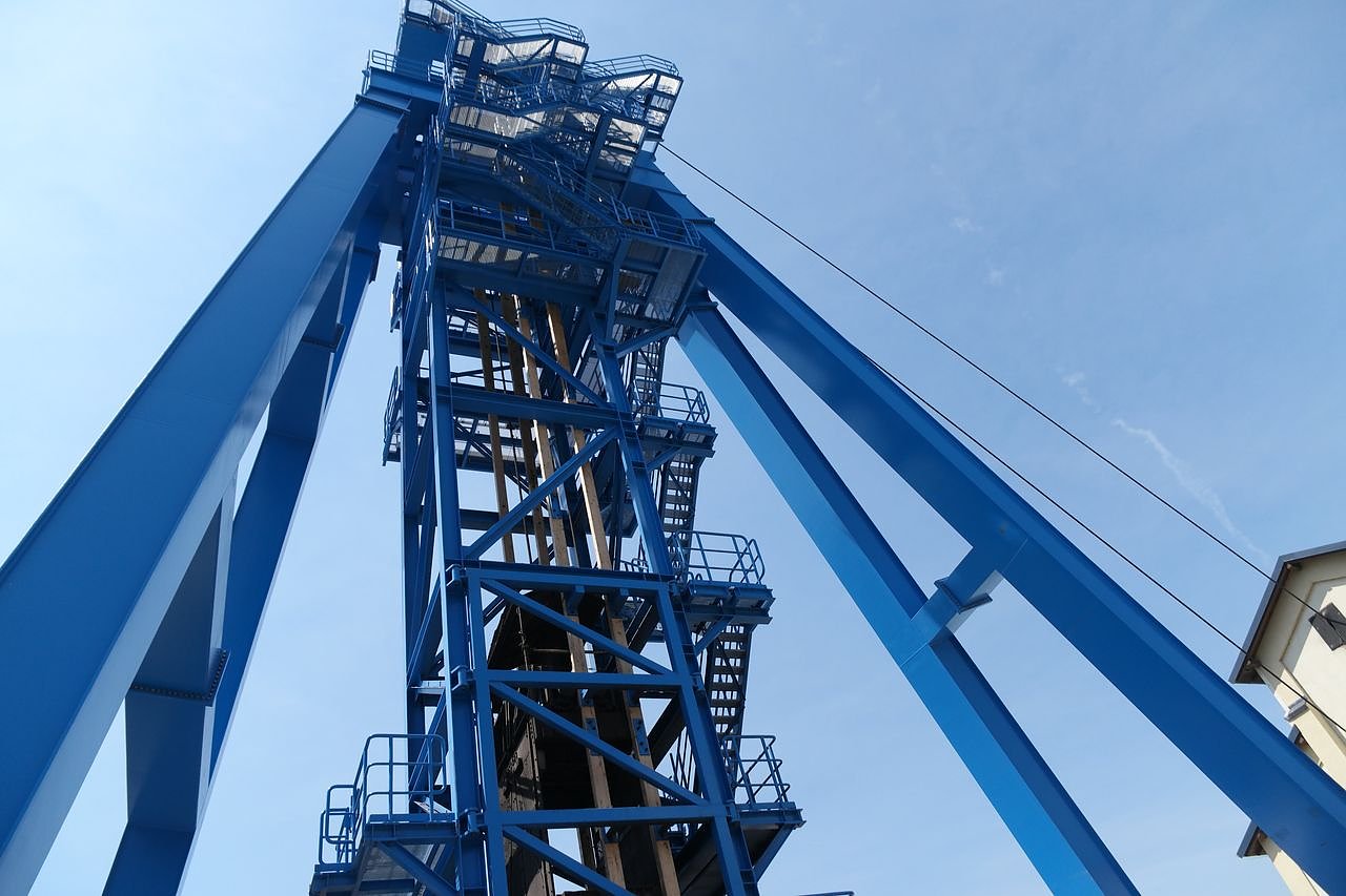 38+72+241: Das neue Fördergerüst, blauer als der strahlend blaue Himmel, ist 38 Meter hoch, es wurde auf 72 Pfählen gegründet sowie mit und in ihm wurden 241 Tonnen Stahl verbaut.