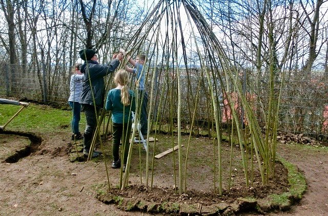 Die praktische Umsetzung erfolgte in den Osterferien. Mit viel Kraft, Teamwork, Ehrgeiz und Durchhaltevermögen wurden die Weidenruten gepflanzt und verflochten und anschließend ordentlich gewässert. Ergänzt wird der Platz mit drei Holzplastiken, die künstlerisch individuell gestaltet das Geschehen bewachen sollen.