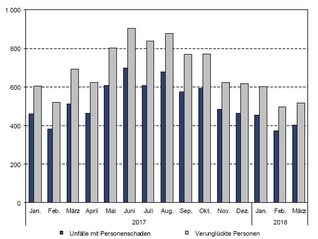 Die Zahl der schwerverletzten Menschen sank im Vergleich zum Vorjahresmonat März 2017 um 41 und damit fast um ein Drittel. Ebenfalls rückläufig war die Zahl der Leichtverletzten (-24,5 Prozent).