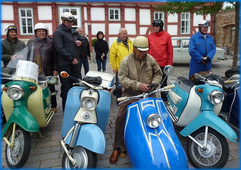 Der Älteste von den 15 Teilnehmern mit 81 Jahren nahm mit einem Motorroller "Pitty" an der Ausfahrt durch zahlreiche Orte des östlichen Eichsfeld, zum Teil bei leichten Regen und unterkühlten Temperaturen, ohne Probleme teil. Per Achse angereist war auch Hansi Vogel aus Großbrüchter, der als technischer Experte auf dem Gebiet der Geschichte der Motorroller gilt und mit seiner Frau ein eigenes kleines Museum im benachbarten Kyffhäuser Kreis betreibt.