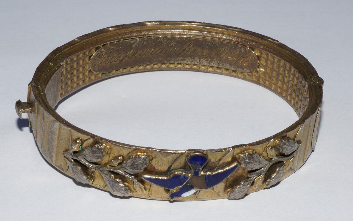 Ein Objekt der Ausstellung: Ein Armreif mit der Innschrift Kriegserinnerungen 1914/18
