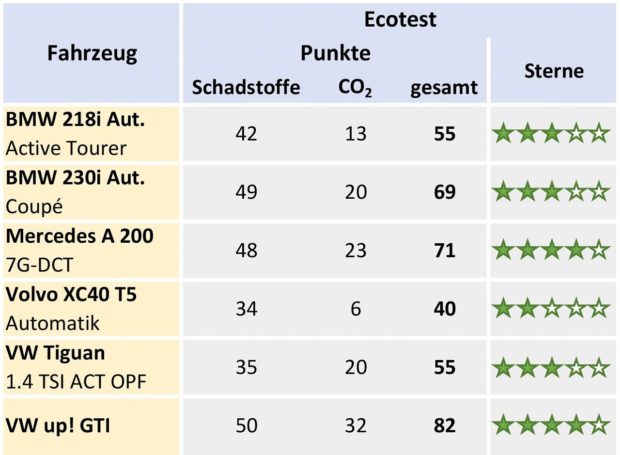 Der ADAC Ecotest ist eine gesamtheitliche Betrachtung des Umweltverhaltens eines Autos. Neben den Schadstoffen werden auch der Verbrauch und die damit verbundene CO2-Bilanz betrachtet. Unter Berücksichtigung beider Aspekte werden abschließend zwischen einem und fünf Sterne vergeben. Die Gesamtergebnisse der sechs getesteten Modelle ergeben ein durchwachsenes Bild. Während der VW up! GTI und der Mercedes mit sauberen Abgasen und moderatem Verbrauch vier Sterne und damit eine Empfehlung erhalten, reicht es für die beiden BMWs und den Tiguan nur für drei Sterne.