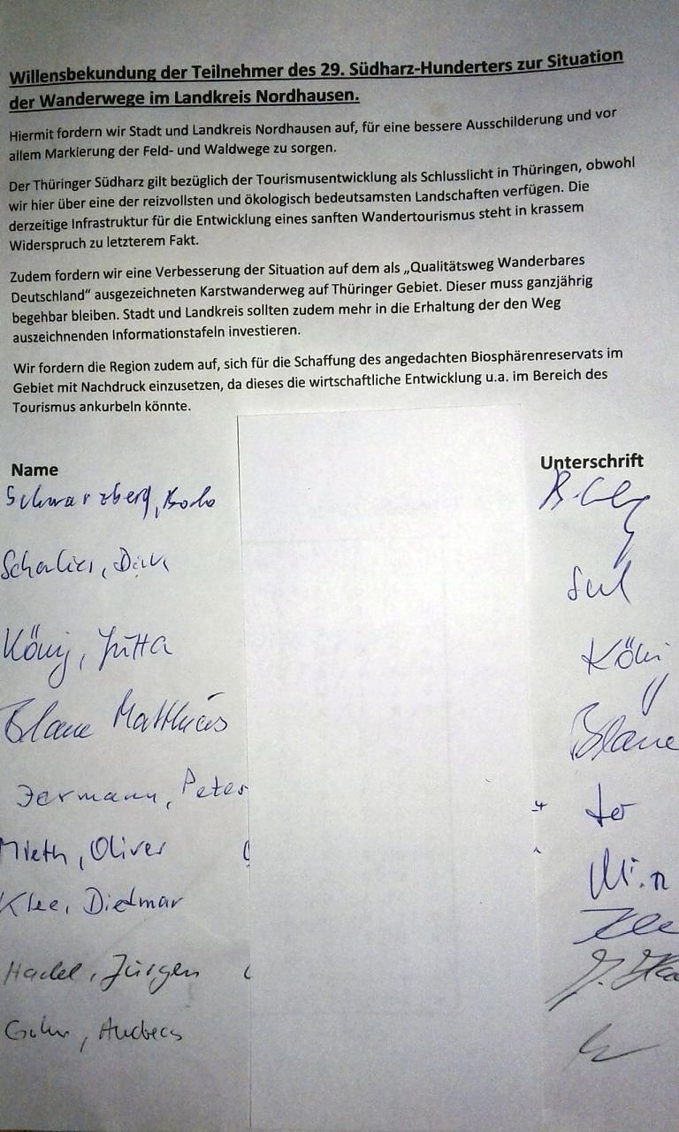 hiermit erhalten Sie die symbolische Unterschriftenliste von Teilnehmern des 29. Südharz-Hunderters im Februar 2018, die zwecks Verbesserung der Ausschilderung und Markierung des Wegenetzes im Landkreis Nordhausen angefertigt wurde.