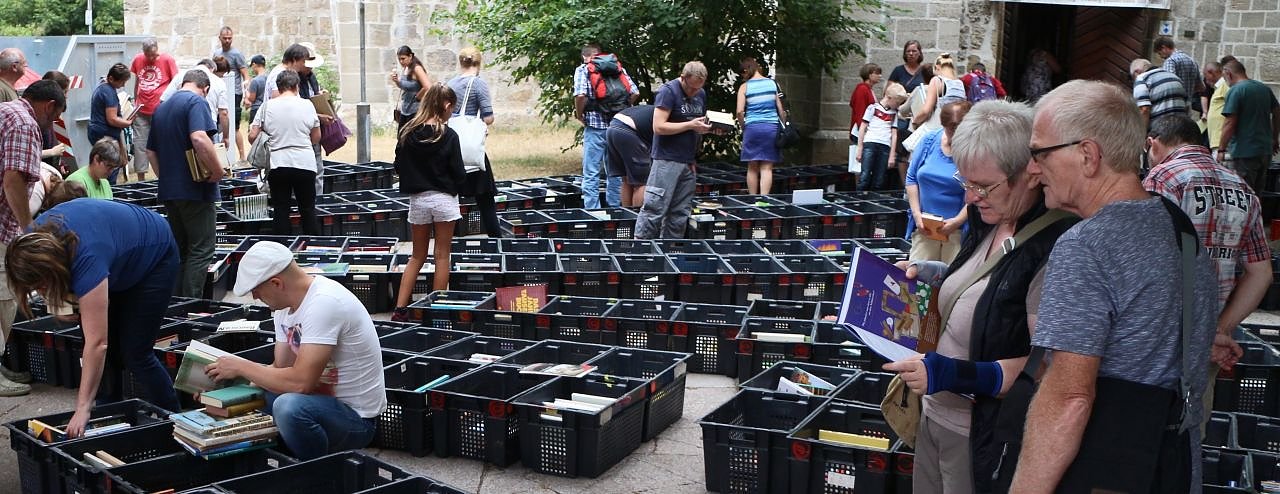 Autor: redZwölf Uhr, die Stunde schlägt und Frank Tuschy vom Kinderkirchenladen verkündet den stöbernden Bücherfreunden auf dem Blasii-Kirchplatz das jedes Buch jetzt nur noch 50 Cent kostet. Um 14 Uhr gibt es den nächsten Preissturz, dann gibt es Literatur für 10 Cent pro Buch.