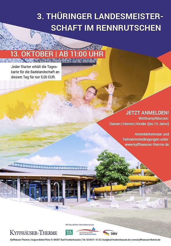 In der Kyffhäuser-Therme Bad Frankenhausen wird am Samstag, den 13. Oktober 2018 ab 11:00 Uhr zum dritten Mal die Thüringer Landesmeisterschaft im Rennrutschen ausgetragen.