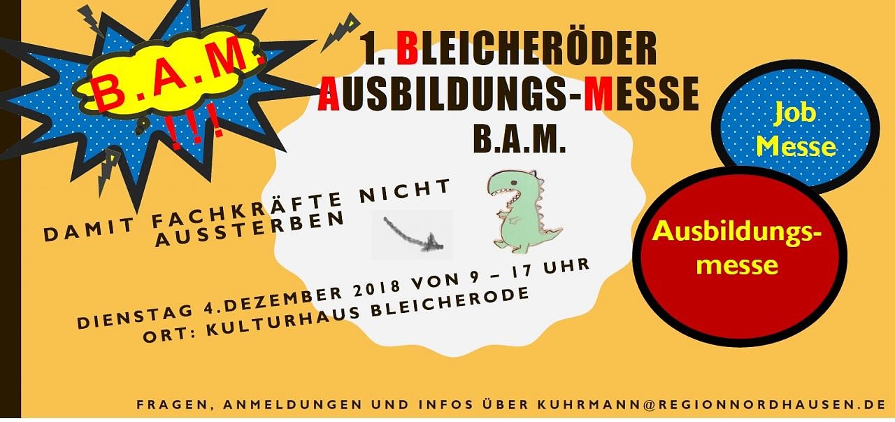 B.A.M.!! ! Am 4. Dezember startet die 1. Bleicheröder Ausbildungs- und Jobmesse, um Unternehmen wie auch Ausbildungs- und Jobsuchenden eine Plattform für einen Austausch zu bieten...