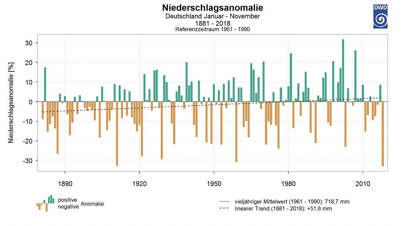 Auch beim Niederschlag sind die ersten elf Monate des Jahres so trocken gewesen wie nie zuvor. Insgesamt fielen bisher 482 Liter pro Quadratmeter. Das sind nur 67 Prozent der in diesen Zeitraum üblichen Menge. Das Tripel vollständig macht die bisherige Sonnenscheindauer im Jahr 2018. Von Januar bis November wurden vom DWD 1990 Sonnenscheinstunden gemessen – ein Plus von 32 Prozent im Vergleich zum vieljährigen Durchschnitt. Fest steht bereits jetzt, dass im Jahr 2018 die bisher höchste Anzahl Heißer Tage (Tmax ≥ 30 °C) und Sommertage (Tmax ≥ 25 °C) registriert wurden.