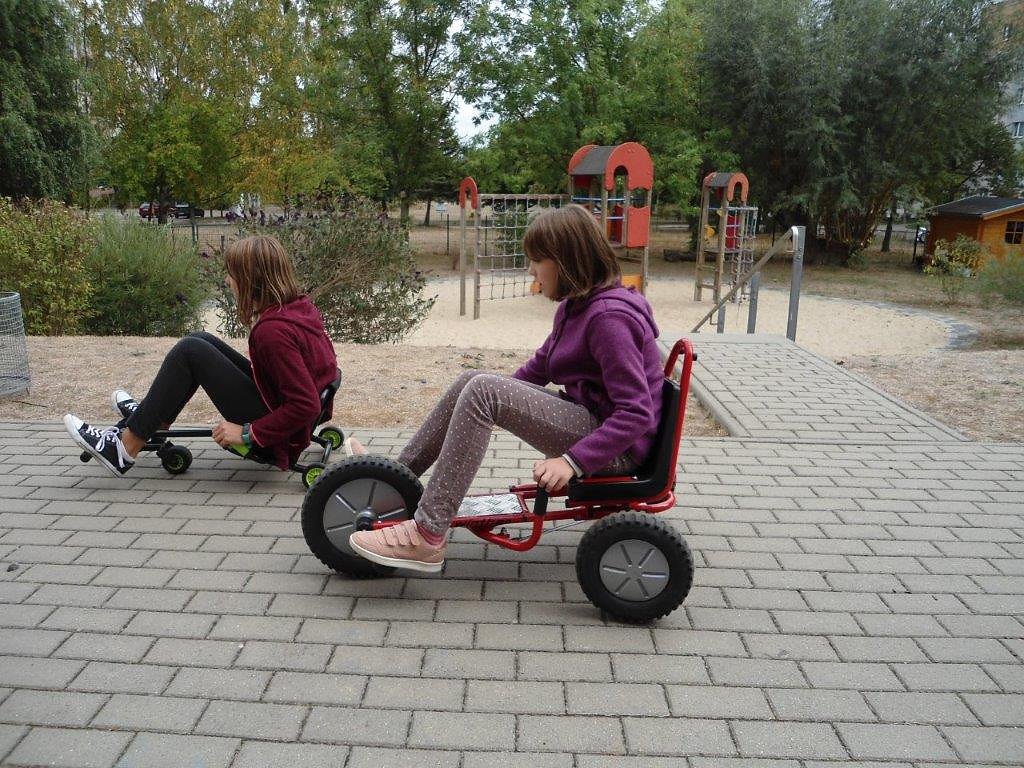 Die Anzahl der beliebten Fahrzeuge reicht sehr oft nicht aus. Das in das Alter gekommene Trampolin musste im Frühjahr leider außer Betrieb genommen werden. Aber seit einiger Zeit können die Kinder wieder auf einem kleinen tollen Trampolin springen und mit einem nagelneuen hochwertigen Funracer ihre Geschicklichkeit testen Es werden Fahrzeuge zusammengefügt und Rennen gefahren. Sichtlich ist der Spaß an den Aktionen zu erkennen.