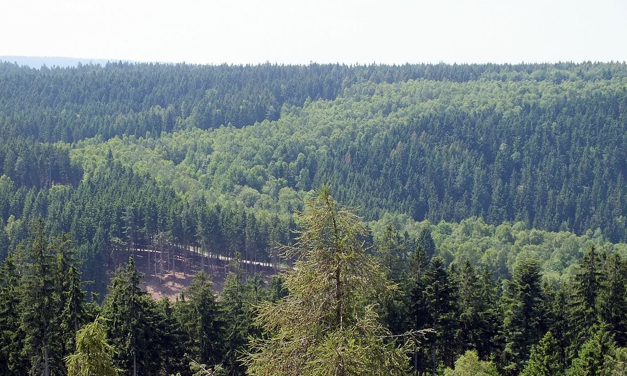 Der ehemalige Verlauf der innerdeutschen Grenze von der Thüringer Warte gesehen, zu erkennen als helleres Laubwaldband (Foto: Martin Geisler)