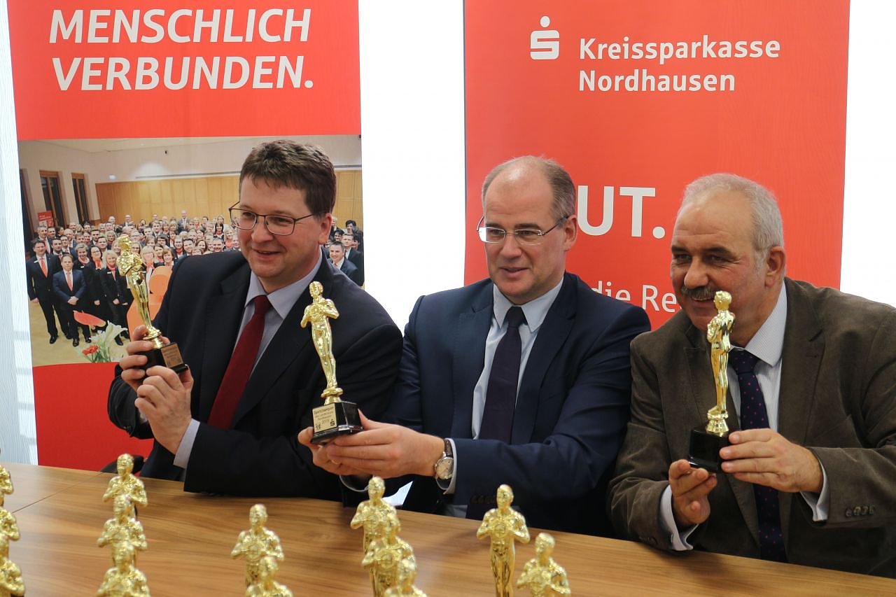 v.l.: Sparkassenvorstand Thomas Seeber, Landrat Matthias Jendricke und Schulsportkoordinator Werner Hütcher (Foto: Angelo Glashagel)