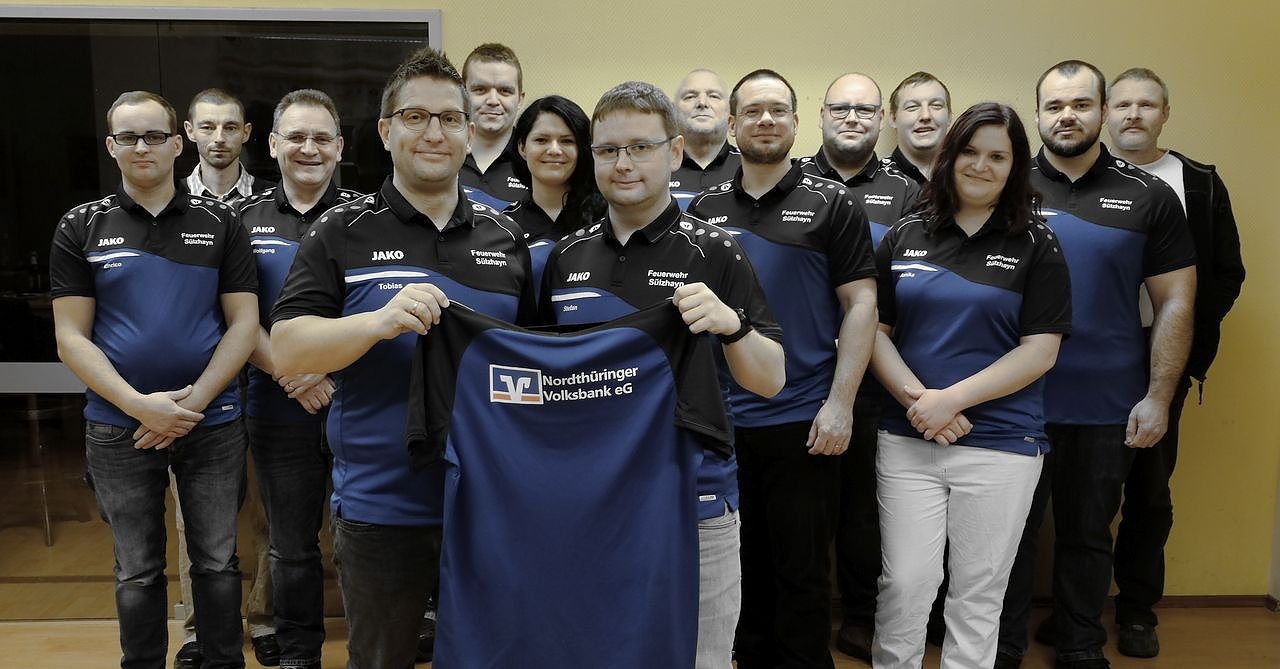 Unser Dank geht an den Sponsor, die Nordthüringer Volksbank. Einsätze und Ausbildung sind oftmals sehr schweißtreibend, sodass die Funktionsshirts hier sehr gute Dienste leisten werden.