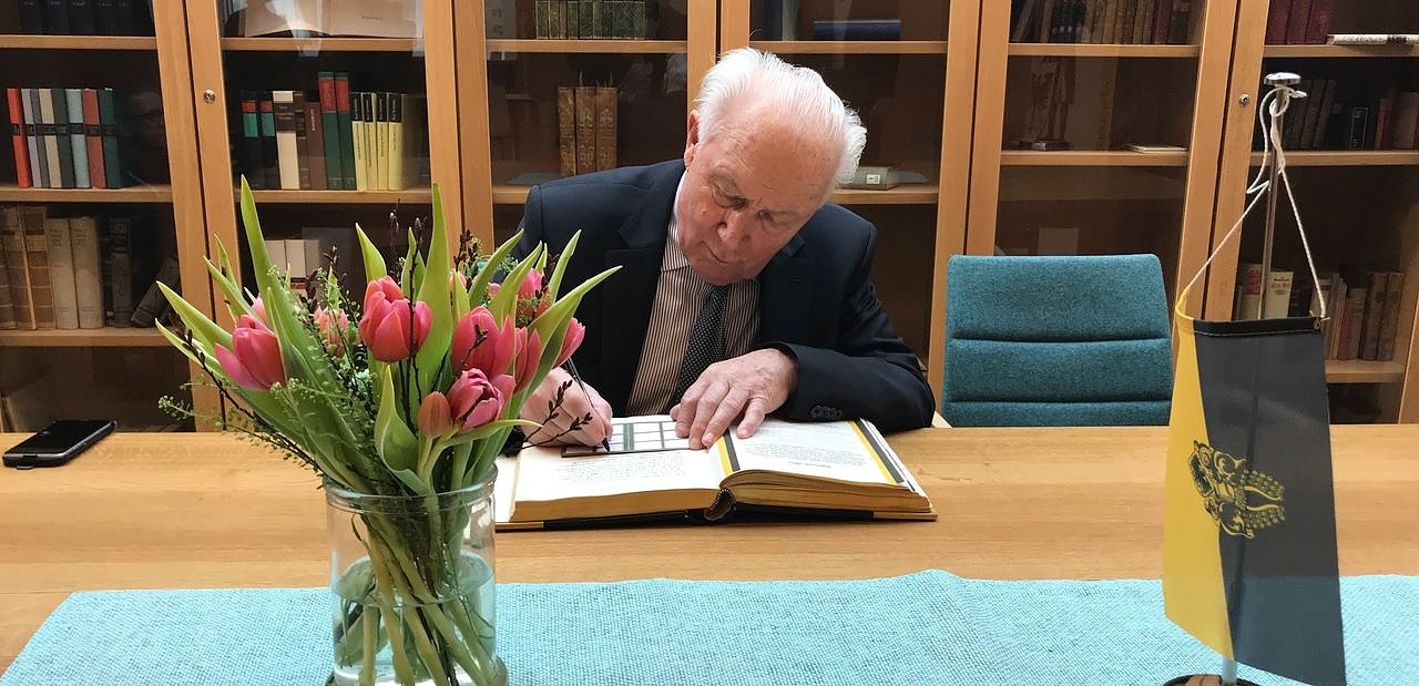 Vor dem Vortrag im Nordhäuser Bürgerhaus trug sich Sigmund Jähn in das Goldene Buch der Stadt Nordhausen ein