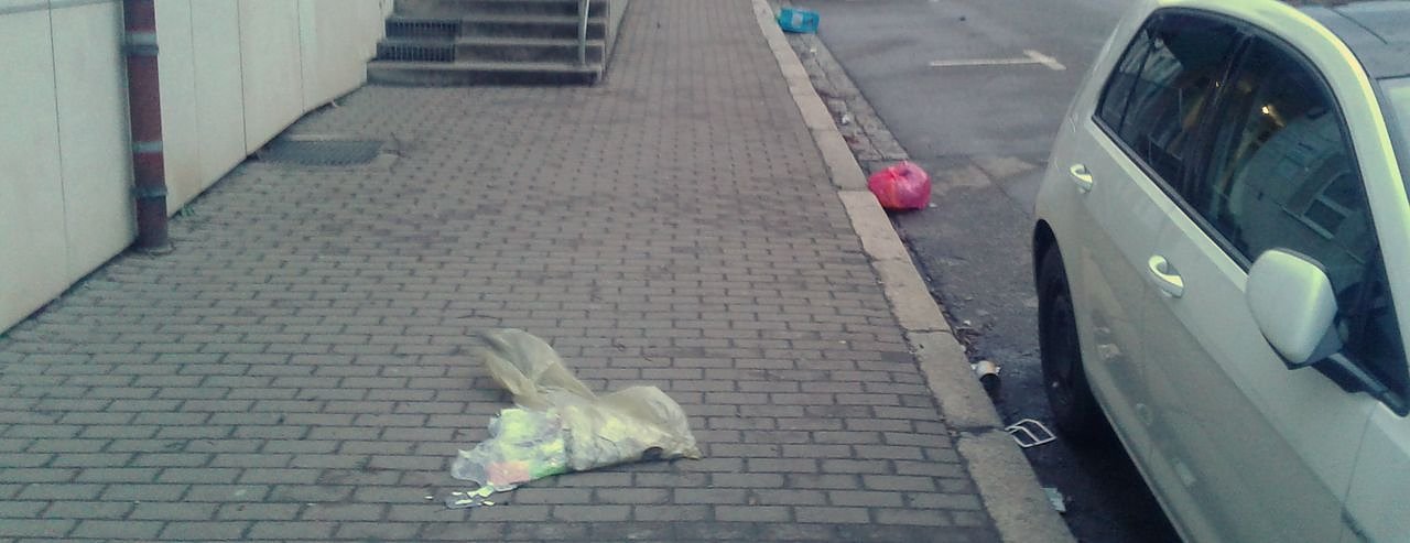 Am Hagen rollten am Sonntagabend gut ein Dutzend prall gefüllte Säcke umher, einige haben sich dabei mit der Folge geöffnet, dass sich ihr Inhalt auf der Straße und entlang der Hauswände verteilte, vom Wind gut hörbar immer weiter getrieben: Milchtüten, Joghurtbecher, Plastelöffel und –flaschen, Plastiktüten. Manche blieben in Hauseingängen und an Bordsteinen liegen oder in Büschen und Bäumen hängen. Autofahrer erschrecken, weil sie plötzlich Müllsäcken ausweichen müssen. Umherfliegender Müll als Sicherheitsrisiko.