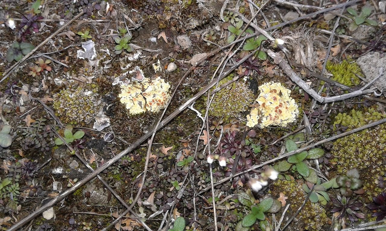 Die vom Aussterben bedrohte Gewöhnliche Feuerflechte, vor wenigen Tagen im Landkreis Nordhausen fotografiert. Noch ist sie Teil des "Hotspots 18 der Artenvielfalt".Doch obwohl diese Worte durchaus ein auffälliges Aussehen suggerieren, übersieht man die Gewöhnliche Feuerflechte leicht. Kleine gelbe Flecken auf kargem, kalkhaltigem Boden, die sich wegen ihrer geringen Höhe gerade einmal mit den Fingerkuppen erfühlen lassen.