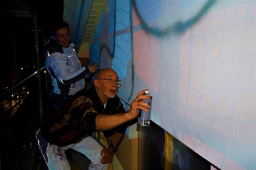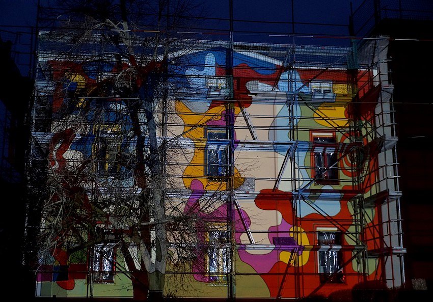 Auch sonst ist der Chef die ganze Zeit mit in die Arbeiten eingebunden. Bei so einem wichtigen Auftrag ist er nochmal ganz in seinem Element. Eben sitzt er noch in einem Projektor-Zelt auf der gegenüberliegenden Straßenseite und sorgt gemeinsam mit allen Mitwirkenden für die korrekte Ausrichtung des Bildes. Wenige Minuten später steht er auf der obersten Gerüstetage und sprüht mit Malermeisterin Judith Burghardt und den beiden Kollegen Christian Steinecke und Manuel Breitsprecher die ersten Konturen für das ursprünglich durch einen Praktikanten des Jugendsozialwerkes entworfene Farbkonzept im Hundertwasser-Stil auf das Mauerwerk.