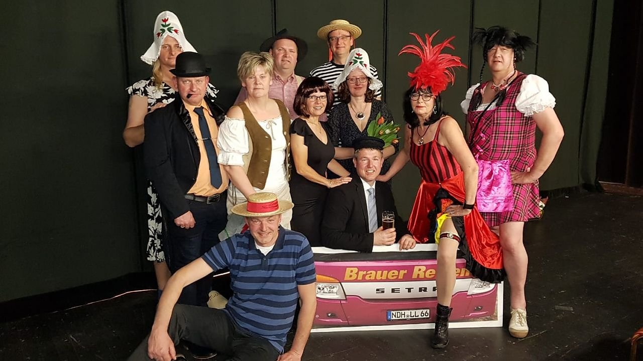 Aber auch das Brauer-Team wollte noch einmal auf die Bühne, diesmal als Shantychor. Doch plötzlich wurde Michael Simon zum Interview wie bei der Talkshow Inas Nacht gebeten. Zum 25-jährigen Betriebsjubiläum bei Brauer Reisen eine gelungene Überraschung! Als Geschenk überreichte ein Gast aus Afrika eine Original Trommel von dort.