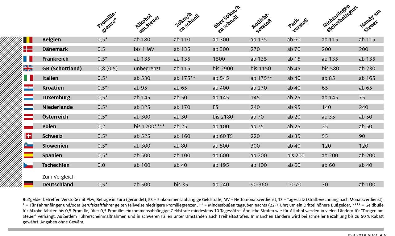An der Spitze der Länder mit den höchsten Bußgeldsätzen stehen neben den skandinavischen Ländern Norwegen, Schweden und Finnland auch die Niederlande, die Schweiz und Italien. Wer 20 km/h zu schnell fährt, riskiert in Norwegen ein Bußgeld von mindestens 480 Euro. In Schweden sind es 230 Euro, in Finnland 200 Euro, in Italien 175 Euro, in den Niederlanden 170 Euro und in der Schweiz 160 Euro. In Deutschland muss man dafür höchstens 35 Euro berappen.