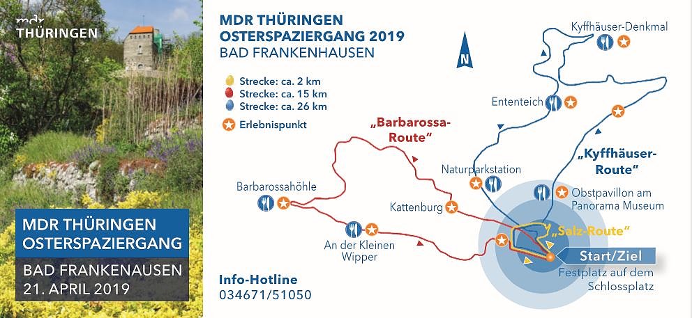 Radio, Fernsehen, Online vor Ort: MDR THÜRINGEN berichtet ausführlich über die Vorbereitungen und sendet am Ostersonntag live aus Bad Frankenhausen. Die Reporter und Moderatoren Steffen Quasebarth, Nadine Witt, Marko Ramm, Katharina Melzer und Morgenhahn Johannes sind mit zwei Radio-Übertragungswagen am Start, am Ziel und auf den Wanderwegen unterwegs. Das MDR THÜRINGEN JOURNAL zeigt 19.00 Uhr die schönsten Bilder von der Wanderung im Fernsehen. Im Internet können Sie den MDR THÜRINGEN-Osterspaziergang unter mdr-thüringen.de miterleben.