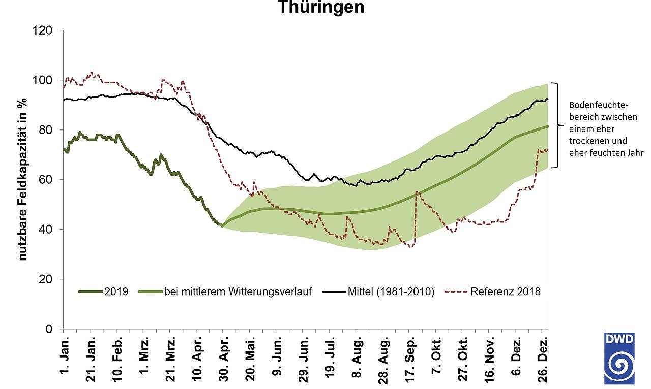 Ein Beispiel: In Thüringen ist Bodenfeuchte unter Gras aktuell schon so niedrig wie im Dürresommer 2018 Mitte Juli. Selbst unter der Annahme eines eher feuchten Witterungsverlaufs wird die Bodenfeuchte im Jahr 2019 in diesen beiden Bundesländern wohl noch bis in den Sommer hinein unter dem vieljährigen Mittelwert liegen.