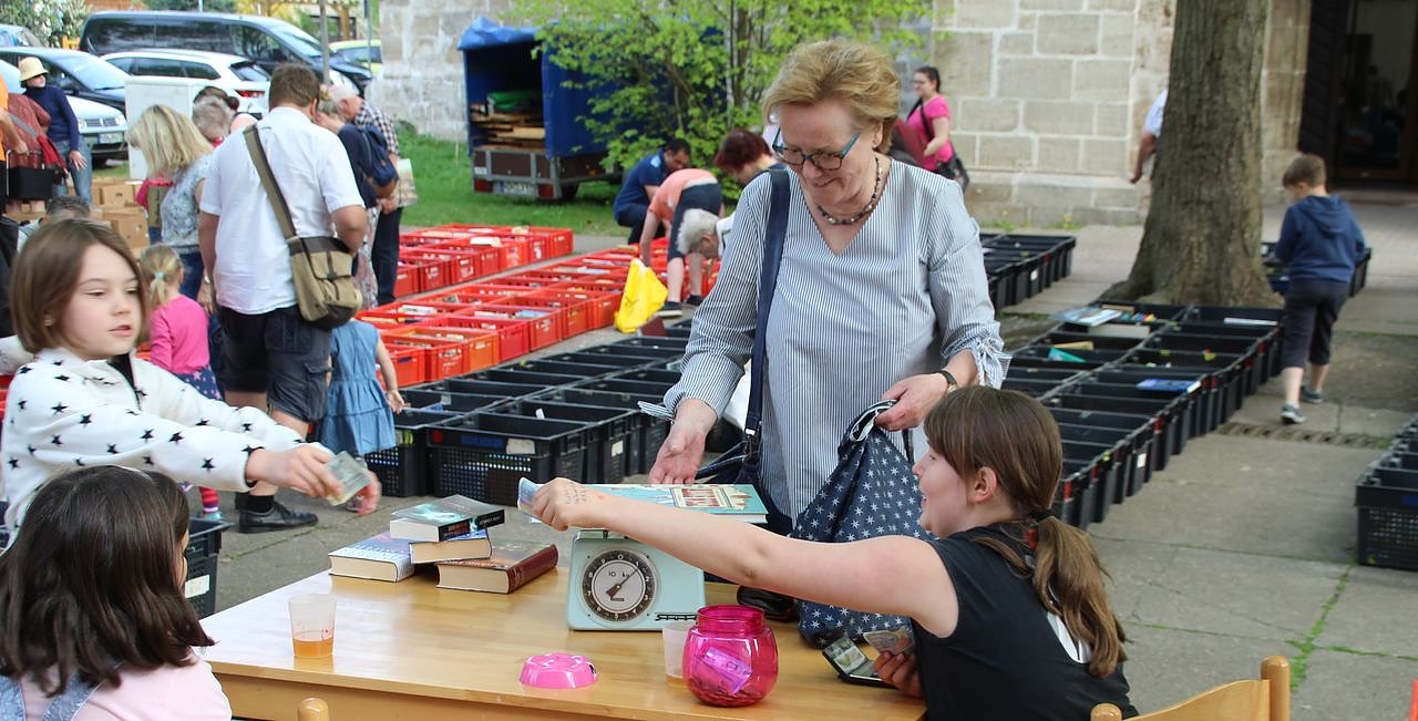 Der Büchermarkt selbst beginnt am 25. Mai für die Käufer um 9.30 Uhr. Zu diesem Zeitpunkt werden die etwa 800 Kisten in langen Reihen auf dem Kirchplatz unter den Lindenbäumen platziert sein, so dass sich jeder Kunde eine eigene Kollektion zusammenstellen kann. Diese Bücherstapel werden dann bei den Kindern (die den Büchermarkt bis dahin mit ihren Küchenwagen umzingelt haben) abgewogen und bezahlt.