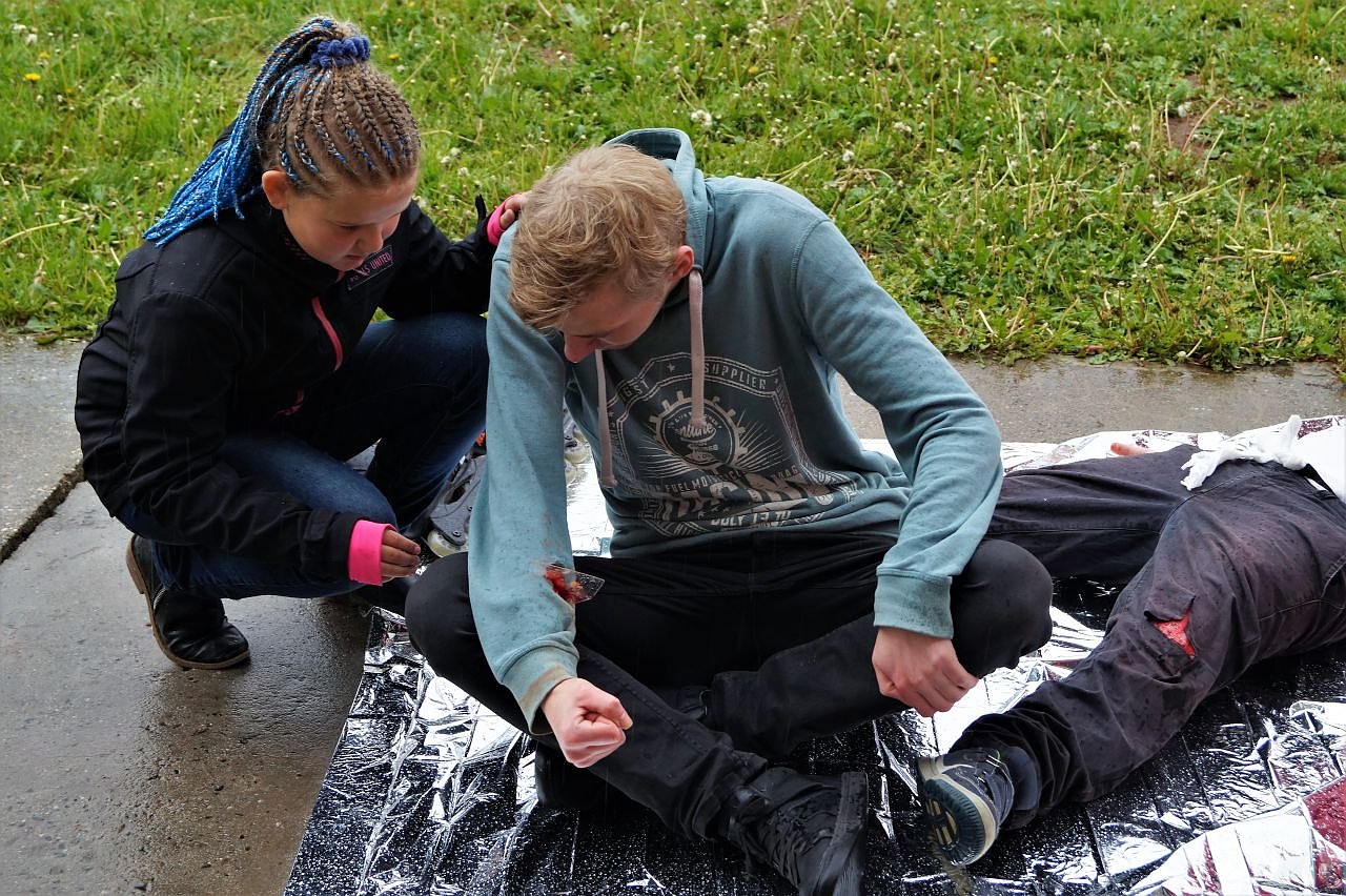 Um einen realitätsnahen und fairen Wettbewerb zu ermöglichen, waren Notfalldarsteller, Helfer und Schiedsrichter im Einsatz. Für die Dramatik und realistische Darstellung der Narben und Wunden sorgte Gudrun Meyer-Osterland. Die Kinder hatten sichtlich viel Spaß und nahmen ihre Aufgabe sehr ernst. Schließlich ging es ja in erster Linie darum, Erste Hilfe zu leisten und Leben zu retten.