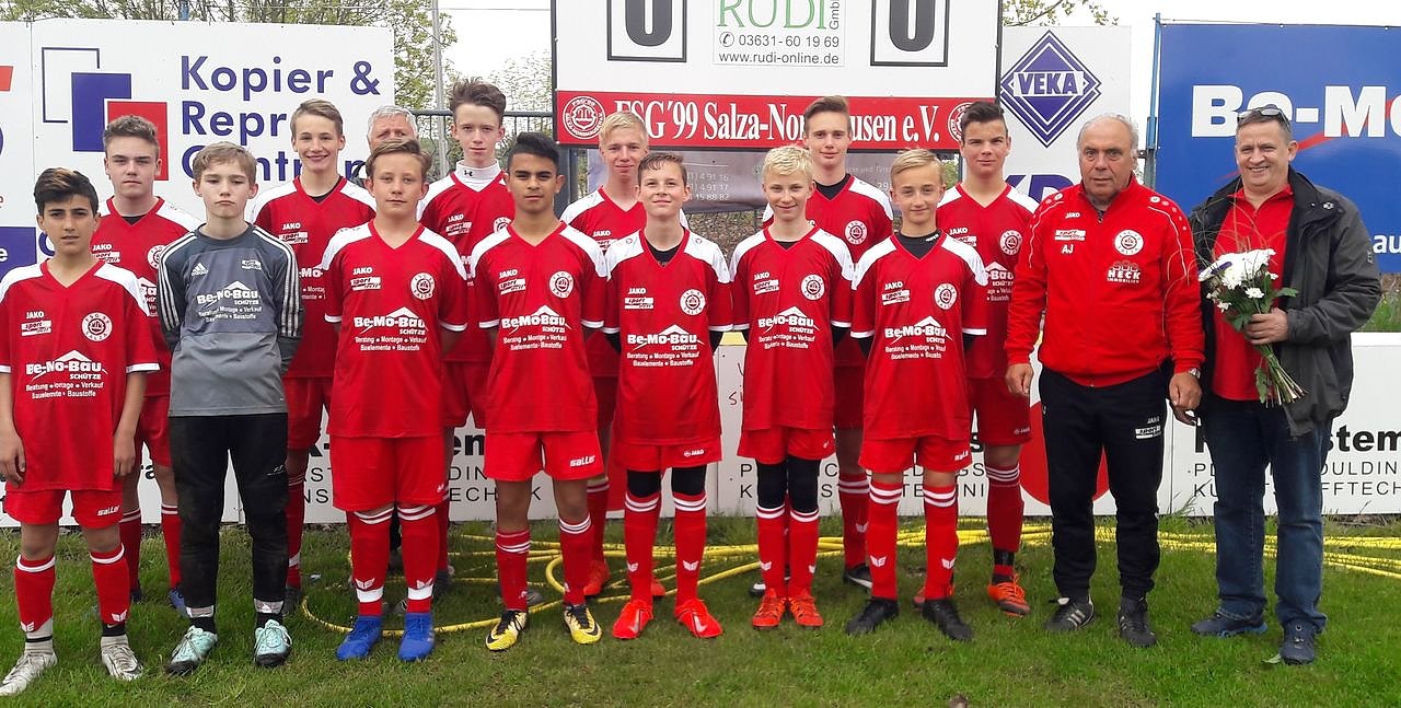 Bernd Schütze von der Firma Be-Mo-Bau überraschte die Jungs der C-Junioren mit einem Satz neuer kurzärmligen Trikots. Die Kicker bedankten sich beim Überbringer mit einem Blumenstrauß und einem überzeugenden 11:0 Sieg im anschließenden Nachholepunktspiel.