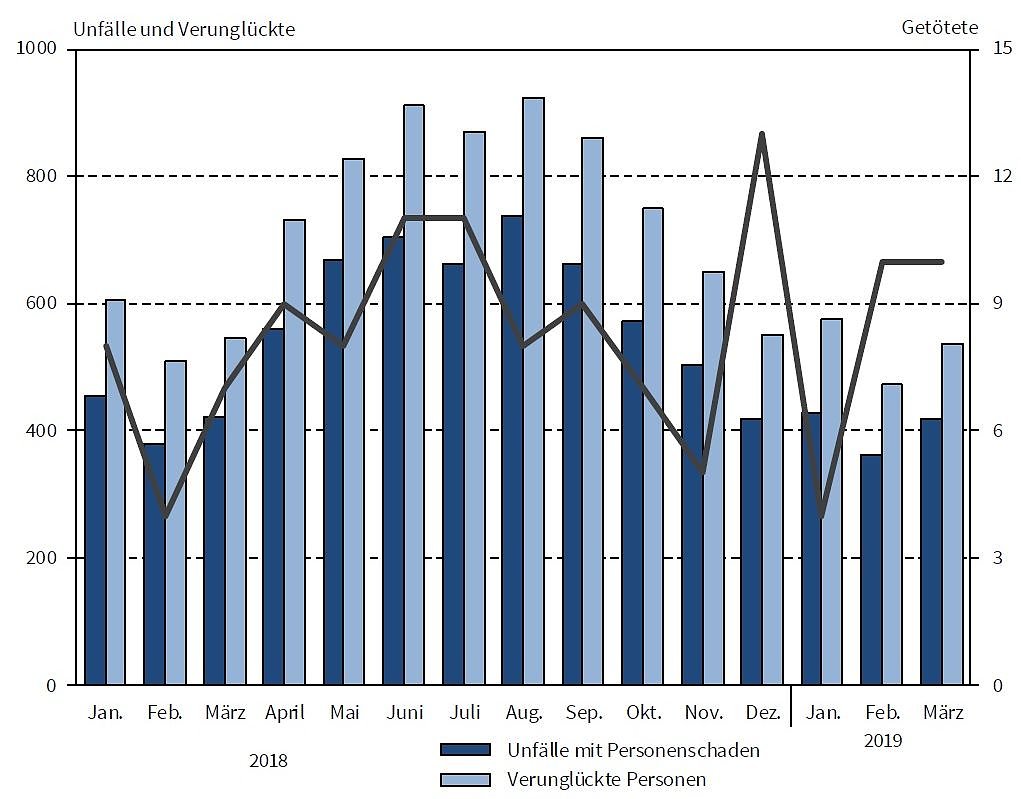Bei den 420 Unfällen mit Personenschaden verunglückten 537 Personen. Damit sank nicht nur die Zahl der Unfälle mit Personenschaden, sondern auch die Zahl der verunglückten Personen im März um 3 Unfälle bzw. 8 Personen.
