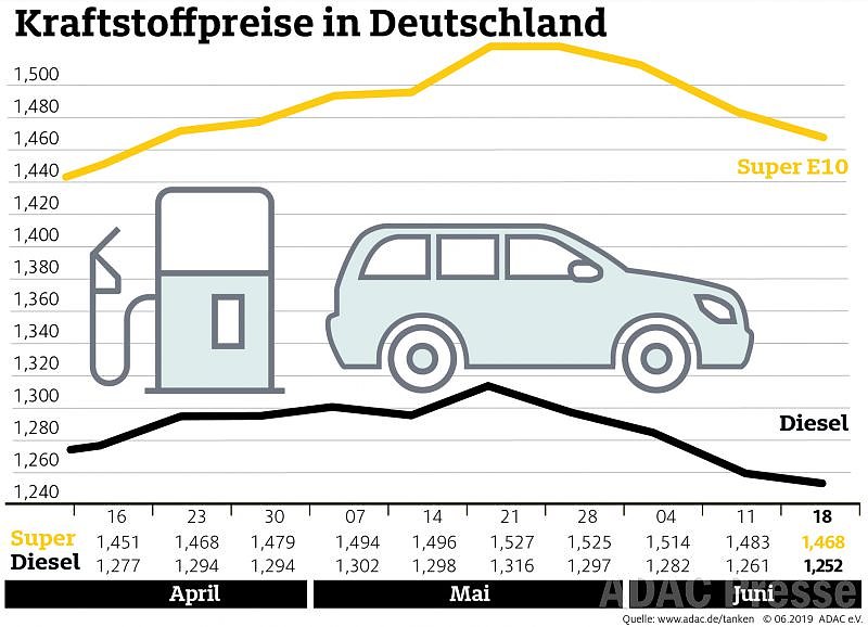 Die Durchschnittspreise sind damit die vierte Woche in Folge gesunken. Die politischen Spannungen im Persischen Golf zeigen bislang keine negativen Auswirkungen. Die Preise für ein Barrel Rohöl der Sorte Brent pendeln wie in der Vorwoche um den Wert von 62 Dollar.