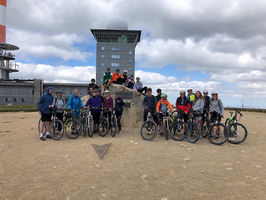 Autor: redNach 60 km und Zeltaufbau klang der Abend an Grill und Lagerfeuer aus. Am zweiten Tag stand mit der Fahrt zum Gipfel des Brockens auf 1142 Meter das Dach der diesjährigen Tour auf dem Etappenplan. Nach dreieinhalb Stunden Fahrt, die stetig bergauf führte und stellenweise sehr steil und herausfordernd war, erreichten alle Radfahrer erschöpft aber glücklich den Gipfelstein.